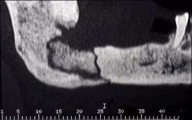 Figure 4. A CT-scan (sagittal view) of the right posterior mandible demonstrating a large and irregular bony sequestrum, pathologic fracture, and sclerosis of the bone surrounding the lesion.