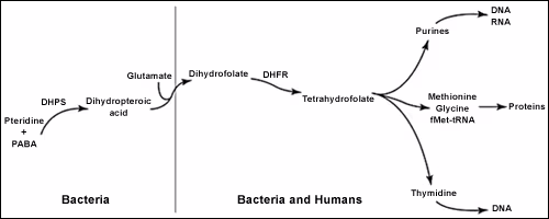 In the replication process, bacteria must synthesize folate. Its synthesis begins with the formation of dihydropteroic acid from pteridine and para-aminobenzoic acid (PAPA), a reaction catalyzed by dihydropteroate synthase (Figure 7).32 Dihydropteroic acid and glutamate condense to form dihydrofolate (DHF).32 Dihydrofolate reductase (DHFR) reduces DHF to tetrahydrofolate (THF). THF is an essential cofactor in the synthesis of DNA, RNA, and proteins (Figure 7).32