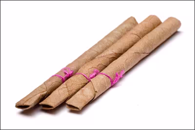 Bidis are small, thin hand-rolled cigarettes mostly made in India and Southeast Asia. They are composed of tobacco wrapped in a tendu or temburnia leaf. Many bidis are flavored. Bidi smoking increases the risk for oral cancer, lung cancer, stomach cancer, and esophageal cancer.19