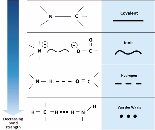 Hydrogen bonds between positively charged hydrogen atoms and negatively charged oxygen, nitrogen, or sulfur atoms and ionic bonds between atoms with an excess of electrons imparting an overall negative charge and atoms with a deficiency of electrons imparting an overall positive charge, are of intermediate strength. Covalent bonds, resulting from the sharing of a pair of electrons between two atoms, are so strong that they are essentially irreversible.